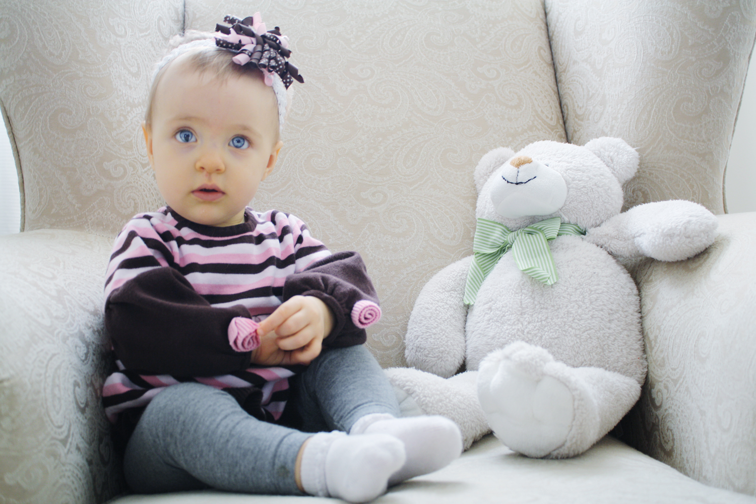 | Gotta love that pose! Isn’t that little hair bow adorable?! My friend Chelsea who works for the Hair Bow Company sent us some adorable things for Kennedy! I have a full review of that coming up soon! |