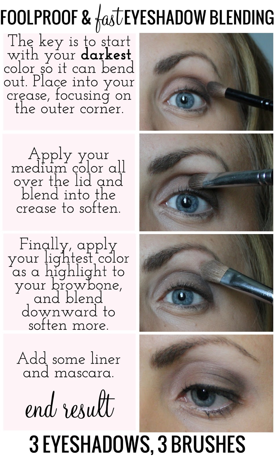 All I’m using is 3 eyeshadows and 3 brushes to achieve this look. Now that’s what I call an eyeshadow blending tutorial.