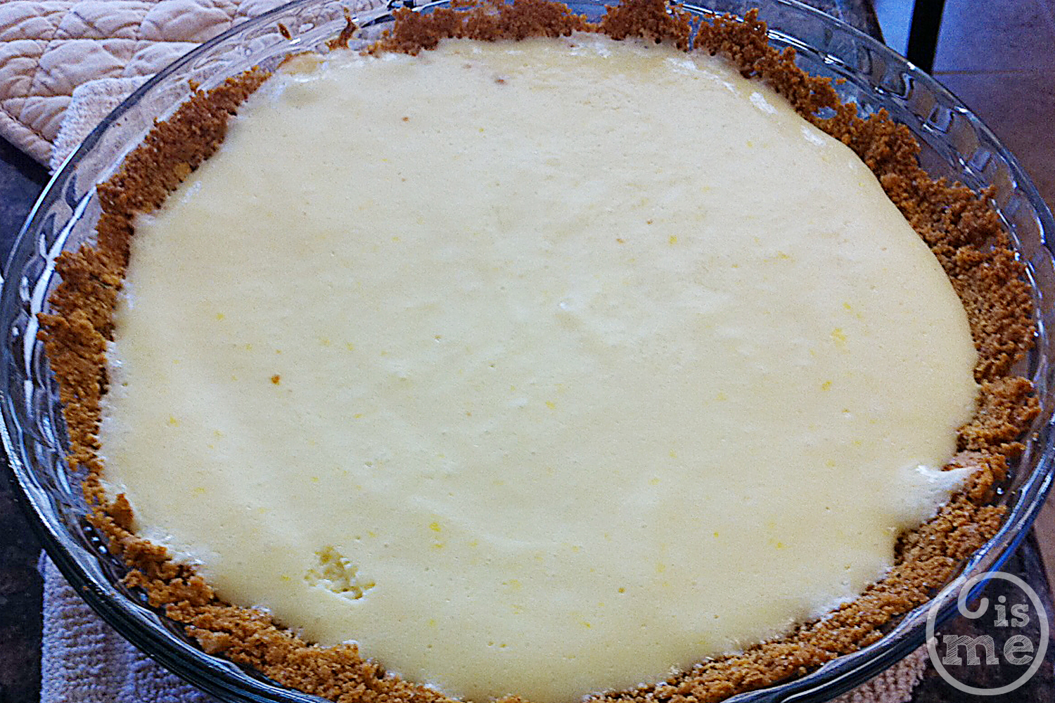 You asked for suggestions on your graham crust since it was falling apart. I followed Maida Heatter’s recipe. Basically, any graham crust recipe would work, but her secret is this: Line your 9″ glass pie pan with aluminum foil. Prepare it this way. Turn the glass pie pan upside down and mold the foil across the bottom of the pie pan – shiny side down. Then put the foil in the pie pan. (The shiny side will be right side up now.) Press the foil down into the pan and crimp the edges. Now place your buttered graham cracker crumbs in and make your crust. Bake at 375 for 8 minutes; remove from oven and cool to room temperature. Then freeze for at least an hour. She recommends freezing overnight if you can. (I couldn’t!) When ready for baking the pie, remove pie crust from freezer and remove the foil carefully holding it with one hand and carefully peeling the foil off with the other hand. Place frozen crust back in pie plate and fill with the filling. Bake. I baked mine for about 15 minutes.