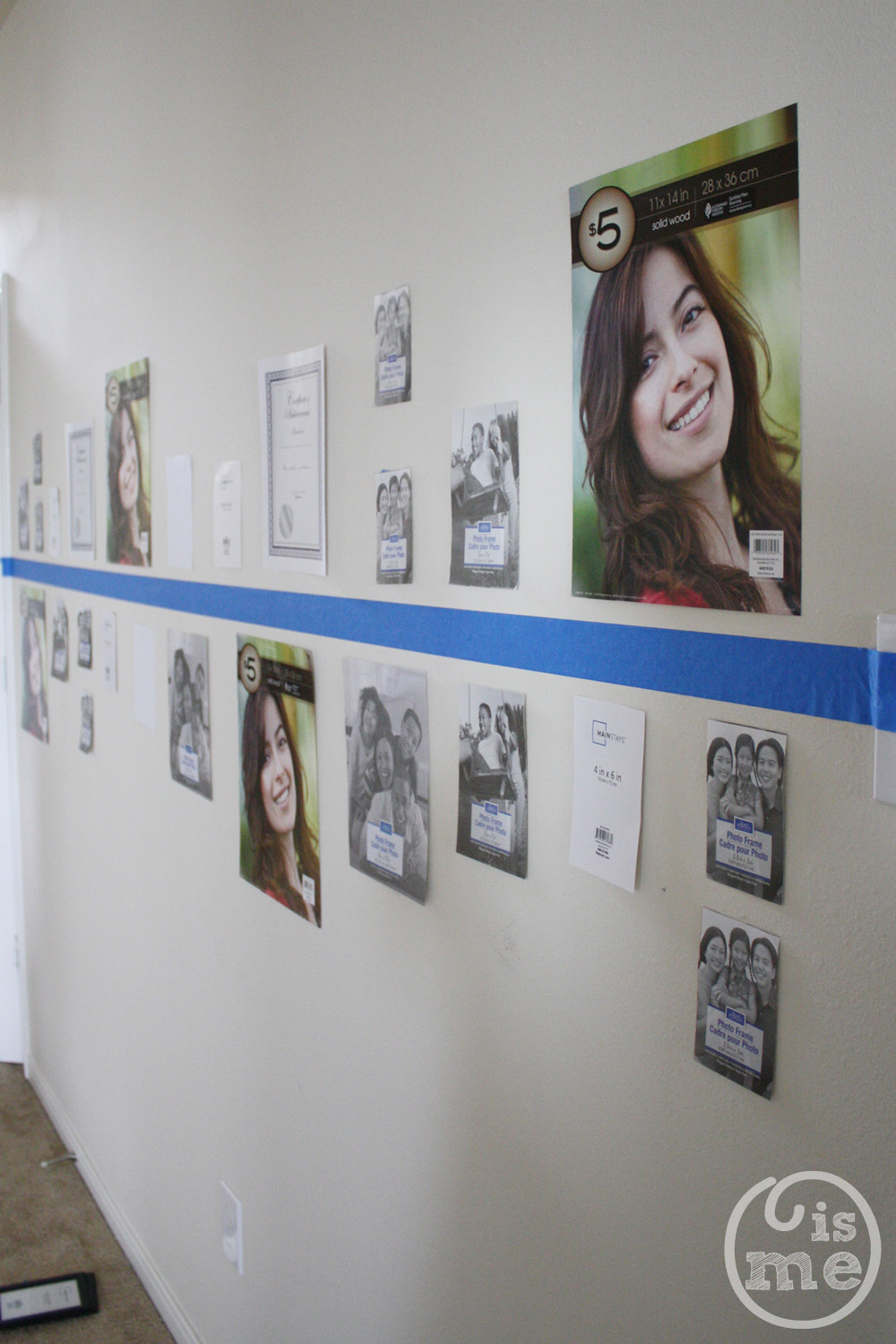 I bought frames ranging from 3×5 to 11×14 all at the dollar store or Walmart. The most I spent on a frame was $5, which was the 11×14 size. The majority of the frames were 95 cents to 1 dollar. I decided it would be easiest just to take the inserts of the frames and arrange them around the line. I knew it wouldn’t account for the frame itself, but I was willing to be a little off around the edges. I spaced them to where I thought the edge of the frame would be. This way I could see if I had enough of each size. My husband said he liked the way it looked like this and I should keep it this way. Ha.
