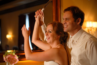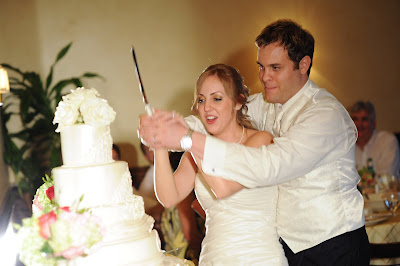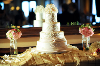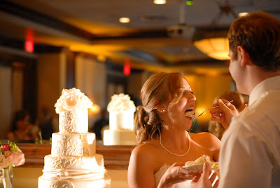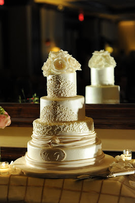 Our wedding cake was DELISH!  Thanks to Edible Designs by Jessie, we were able to design a cake inspired by my wedding dress. She mimicked the lace at the top of my dress and then the pleating and twisting throughout the rest of it. At the bottom was our monogram and at the top were some lovely ivory roses. The cake had an ivory pearl finish to it, as well. We decided to go with one flavor for each of the tiers. We sure liked all of the flavors that we got to taste, but thought it would be nice to be uniform and share the same cake with all of our guests. Our flavor was this absolutely delicious raspberry cream cheese. It was our favorite out of all we tried and was quite a hit with our guests.