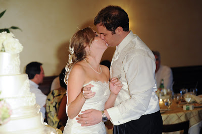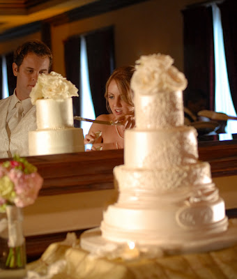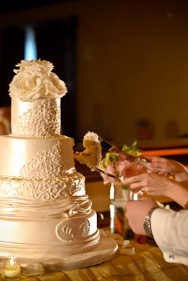 Our wedding cake was DELISH!  Thanks to Edible Designs by Jessie, we were able to design a cake inspired by my wedding dress. She mimicked the lace at the top of my dress and then the pleating and twisting throughout the rest of it. At the bottom was our monogram and at the top were some lovely ivory roses. The cake had an ivory pearl finish to it, as well. We decided to go with one flavor for each of the tiers. We sure liked all of the flavors that we got to taste, but thought it would be nice to be uniform and share the same cake with all of our guests. Our flavor was this absolutely delicious raspberry cream cheese. It was our favorite out of all we tried and was quite a hit with our guests.