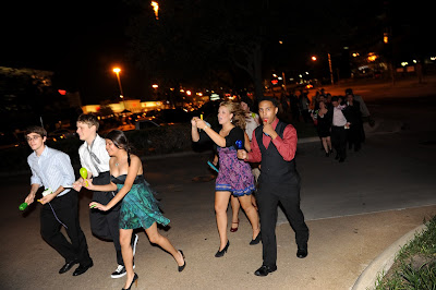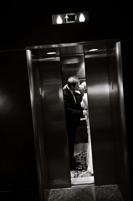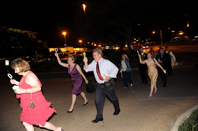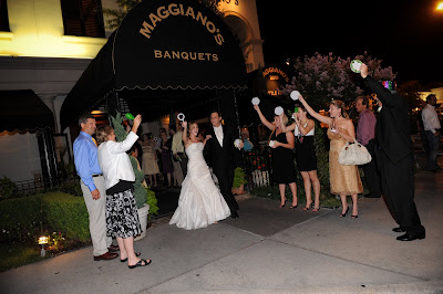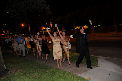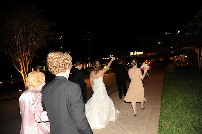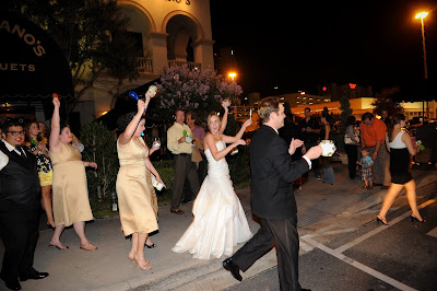 We were going to be a little bit different here. It just so happened that our hotel was literally right next door to our reception site, and there would be no point in us exiting the building and getting in a limo only to take us two seconds down the pavement. So, what would be better than a mass parade next door? Instead of throwing weird things at us, our guests were handed little toy instruments (drums, whistles, noisemakers, etc.) and they all escorted us to the elevator that would take us up to the Presidential Suite!